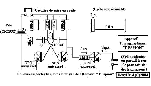 Ayant besoin d'un déclencheur automatique pour mon petit appareil photographique « L'espion » dont la particularité est de s'éteindre tout seul au bout d'environ 20 secondes, j'ai du concevoir et réaliser le montage suivant, avec les contraintes que je m'étaient imposées : faible poids et encombrement, faible consommation de courant, facilité de mise en oeuvre. Voici le résultat de mes cogitations :